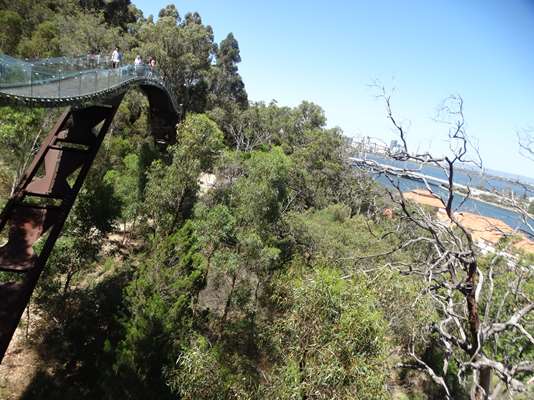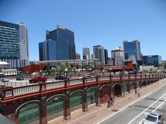 pour arriver à la gare de Perth, qu’on aperçoit ici en bas ; à l’arrière plan, le centre ville