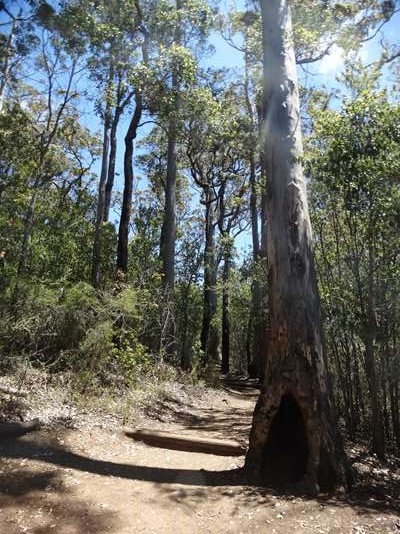 Une autre, un peu plus longue nous fait parcourir la forêt ; il semblerait qu’il y ait eu un incendie, il y a quelques années : les troncs des karris sont calcinés