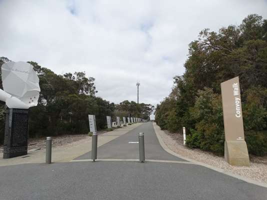 Tout le long de cette allée qui mène à un point de vue, des panneaux ; sur chaque panneau, le nom de 3 navires qui ont transporté les troupes