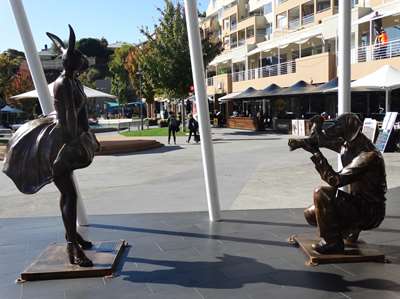 Un petit chien en admiration devant mademoiselle kangouroue (à la Marilyn Monroe)