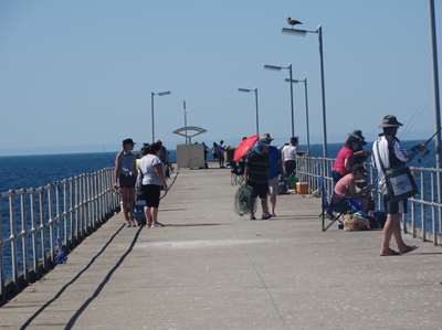 Nous apercevons la jetée du petit port ; nous sommes intrigués par la quantité de pêcheurs qui s'y trouvent : en fait c'est un haut lieu de la pêcheau crabe