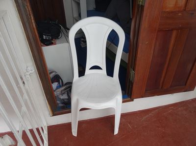 Seule, celle que nous avons choyée, surveillée, dorlotée, cocoonée, que nous n'avons jamais laissée seule, même la nuit (elle dormait dans notre salle de bains) reste à bord. Qui sait si au prochain voyage elle trouvera quelqu'un d'aussi prévenant que nous ? Car il faut le savoir : l'objet le plus utile à bord, c'est bien une chaise !!!