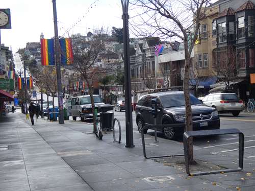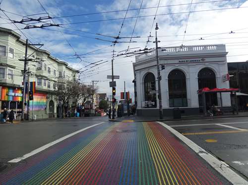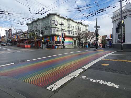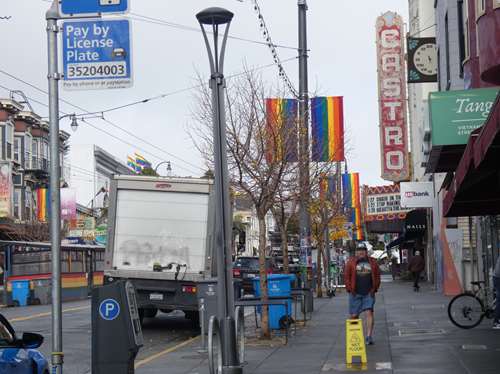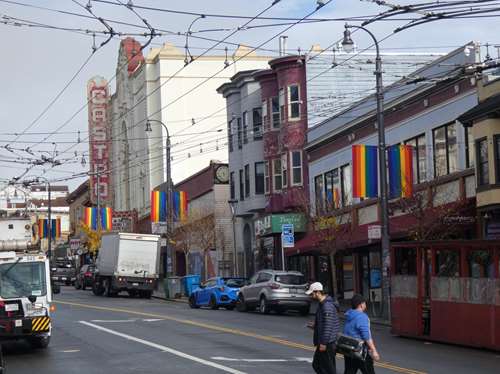 Tous ces drapeaux multicolores qui nous accueillent sont là pour nous dire que nous entrons dans le quartier gay.