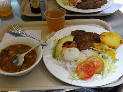 A midi, soupe et une viande avec un peu de tout (ils aiment bien tout mélanger comme ceci)