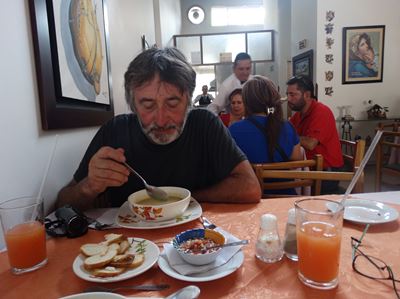 Le meilleur restaurant de notre voyage : tout cela (salade, soupe, lomo à la sauce à l'ananas, riz, purée, dessert et jus) pour 4€