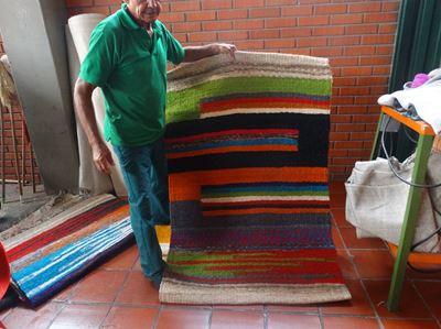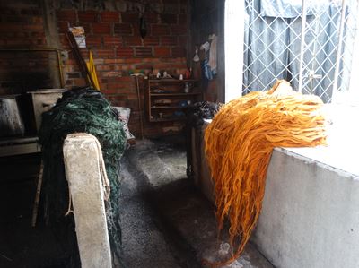 Notre guide, un peu pressé car il avait une réunion de la coopérative à 5 heures, nous a expliqué le processus de fabrication : on part de la plante dont les "feuilles" sont écrasées pour obtenir les fibres (cela dans les fermes) ; ces fibres arrivent à l'usine où elles sont colorées puis démêlées (cardées) en les peignant avec des clous.