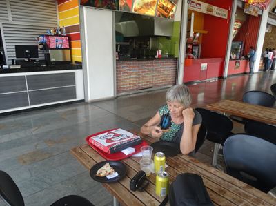 Ce n'est pas aujourd'hui que nous allons prendre du poids : une poche de chips à 2 en haut de la cascade et une petite pizza à 2 dans une restauration rapide à San Gil à 17 heures, avant de prendre le bus