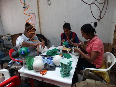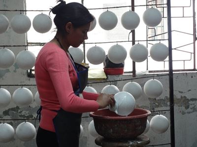 Ces quatre jeunes filles ont bien voulu nous accepter dans leur tout petit atelier où elles collent des ballons