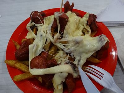 et le soir salchipapas (saucisse de Strasbourg -frites - fromage