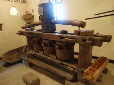 Actionnée par des chevaux, une machine pour broyer les cannes à sucre