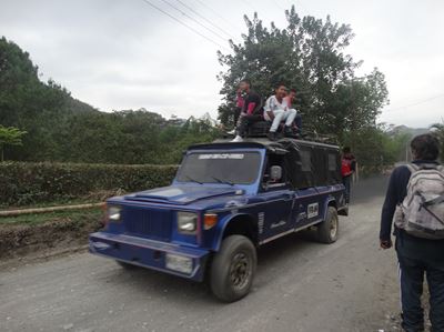 Taxi depuis l'hôtel jusqu'à San Agustin, puis camionnette jusqu'à Pitalito, un colectivo jusqu'à Garzon, un autre plus pourri jusqu'à La Plata (pour passer sur des pistes) et une camionnette avec des bancs à l'arrière jusqu'à Tierradentro