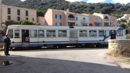 Une petite gare et un petit train (un seul wagon) qui parcourt la ligne Calvi - L'Ile Rousse