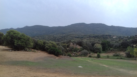 Avant d'aller au village, nous nous arrêtons au bord d'un étang (bien sec en cette saison) aménagé pour une découverte du milieu humide en Corse : l'étang de Tanchiccia