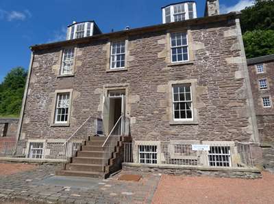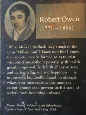 Un arrêt obligatoire pour nous et nos idées : en 1800, Robert Owen, reprenant l'affaire de filature de son beau-père, a implanté dans la vallée un concept de vie sociale idéale : école obligatoire jusqu'à 10 ans, soins médicaux gratuits, un atelier d'apprentissage, une crèche, une cantine publique, une coopérative d'achat, des cours du soir !