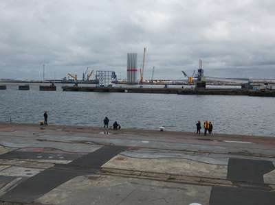 Vue du port d'où des pieds d'éoliennes sont prêts à partir