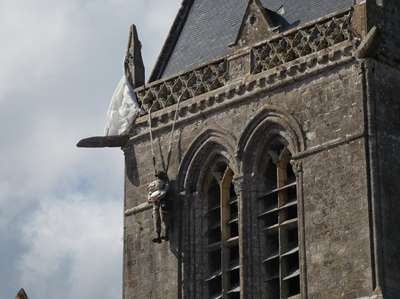 La célebre église et son non moins célebre parachutiste qui est pendu depuis lors. Il paraît que depuis ce jour, il est devenu completement sourd