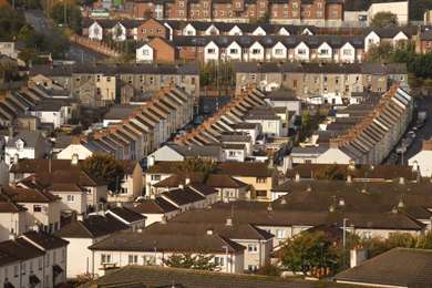 Les quartiers catholiques, vus des remparts, sous ce qui reste de la colonnade