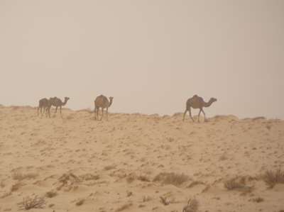 Dans la tempête, dans le désert, apparaissent des dromadaires