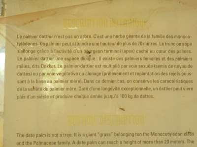 Bonne idée que ce musée consacré au palmier qui n'est pas un arbre, mais une grande plante. On y a appris que le palmier vivait 100 ans, qu'il était propriété du patrimoine, pas du propriétaire (il faut une autorisation pour en abattre). Il y a des palmiers mâles et femelles (1 mâle pour 200 femelles, le pauvre !), chacun produit 100 kg de dattes par an, il y a 250 variétés de dattes, la plus intéressante est la deglet nour. Quand le dattier est prêt à mourir, on récupère par le haut la sève qu'ils appellent le legmi et qui peut être transformée en alcool (contrôlé évidemment)